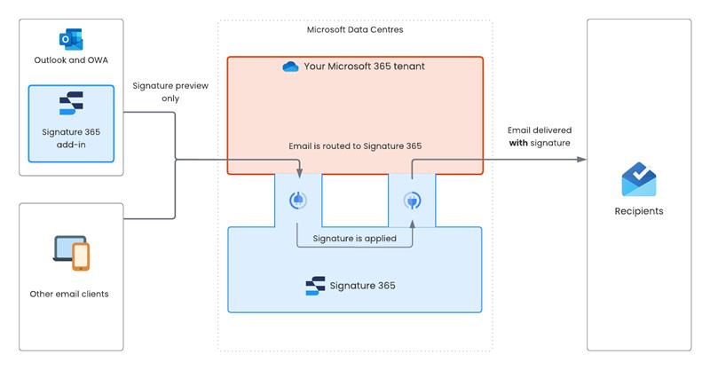 To inject signatures into email, Microsoft 365 is configured to send email via the Signature 365 service. The Signature 365 service injects signatures into and then returns the email to your Microsoft 365 tenant for delivery to the recipients. Because Signature 365 is hosted in Microsoft Azure same as Microsoft 365, your email never leaves Microsoft's data centres.