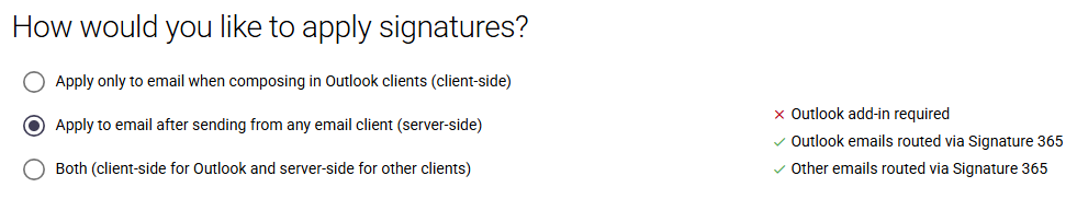 Microsoft 365 server-side signatures will be enabled when the option Apply to email after sending from any email client or Both is selected in the Signature 365 setup wizard: