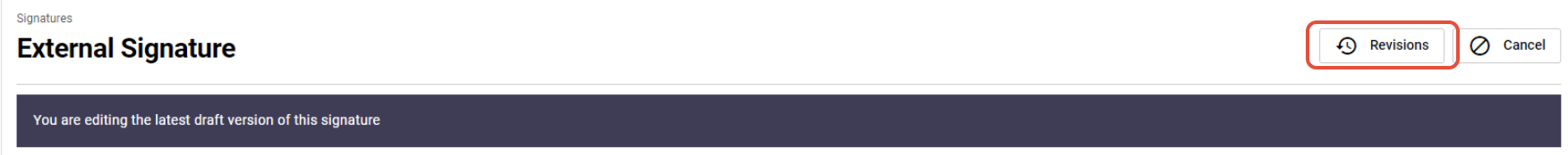 When editing the signature, if revisions exist, you will see the Revisions button at the top right of the page.