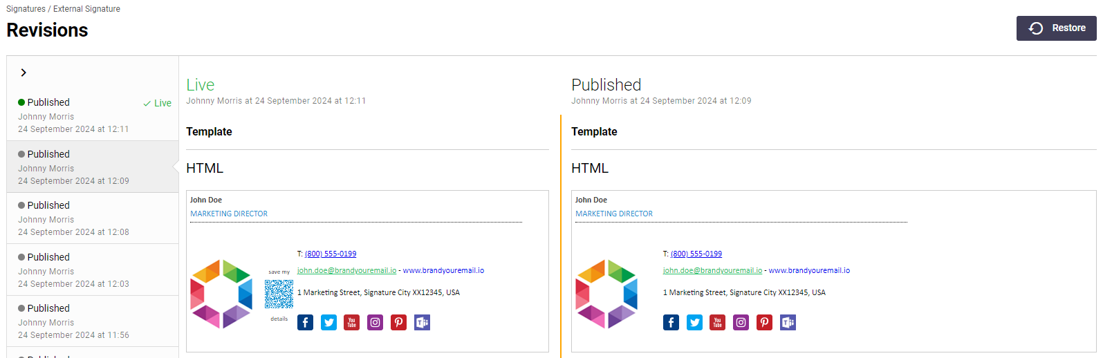 Selecting an older revision from the list will display a comparison with the currently live version. To publish the older revision, click the Restore button. This will create a new draft version of the restored template which you can then edit.